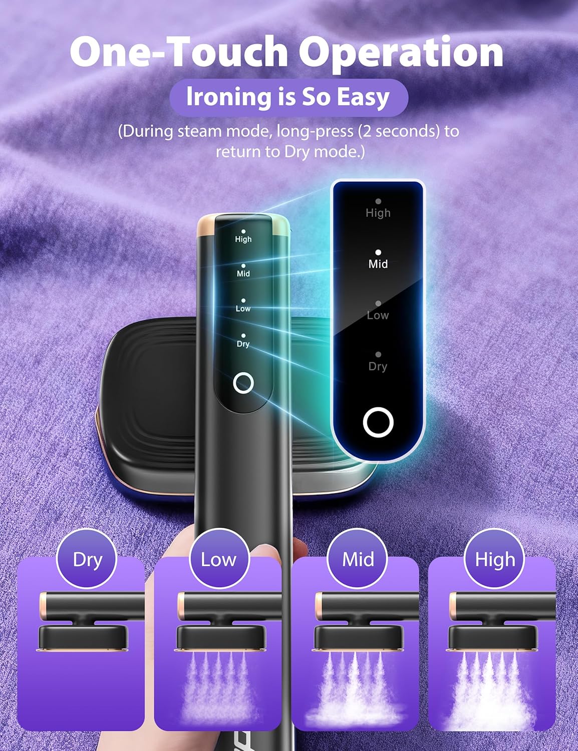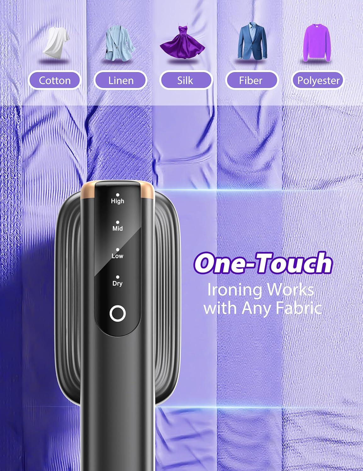 Efficient and powerful performance with 1200W output, 3 steam levels, and advanced panel for quick wrinkle removal on various fabrics.